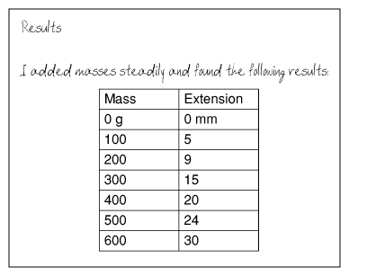 Getting and Recording ResultsTHIS IS LEGACY MATERIAL - the science is correct but the marks no longer apply! A maximum of 8 marks are available for getting and recording results. Here we show what you are expected to do to get up to 4 marks. O.4aEvidence that is adequate for the activity basically means that you need a large enough number of results to be able to draw some sort of conclusion. As a rule of thumb six sets of results are adequate. ![]() Notice how our pupil has realised that adding no mass gave the fantastic result of 0mm - this is an entirely appropriate result! O.4bOur pupil is getting good now - just look what they've done: ![]() They've recorded their evidence clearly in a table with headings! |